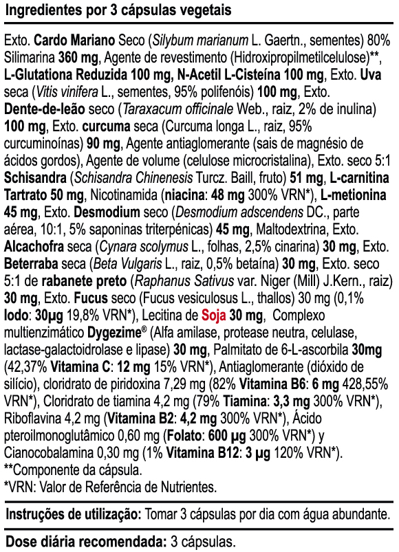 Os suplementos alimentares não devem ser utilizados como substitutos de um regime alimentar equilibrado. Não exceder a dose diária expressamente recomendada. Manter fora do alcance de crianças pequenas. Não recomendado em caso de perturbações hepáticas ou biliares ou de calculose das vias biliares. Em caso de toma de medicamentos, consultar o médico. Pode conter vestígios de glúten, leite, ovo, soja, aipo, dióxido de enxofre, sulfitos, peixe, crustáceos e moluscos (estes alergénios não fazem parte da composição deste produto, que é fabricado numa unidade que utiliza matérias-primas que contêm estes alergénios, mas que minimiza o risco de contaminação cruzada).Ingredientes Completos